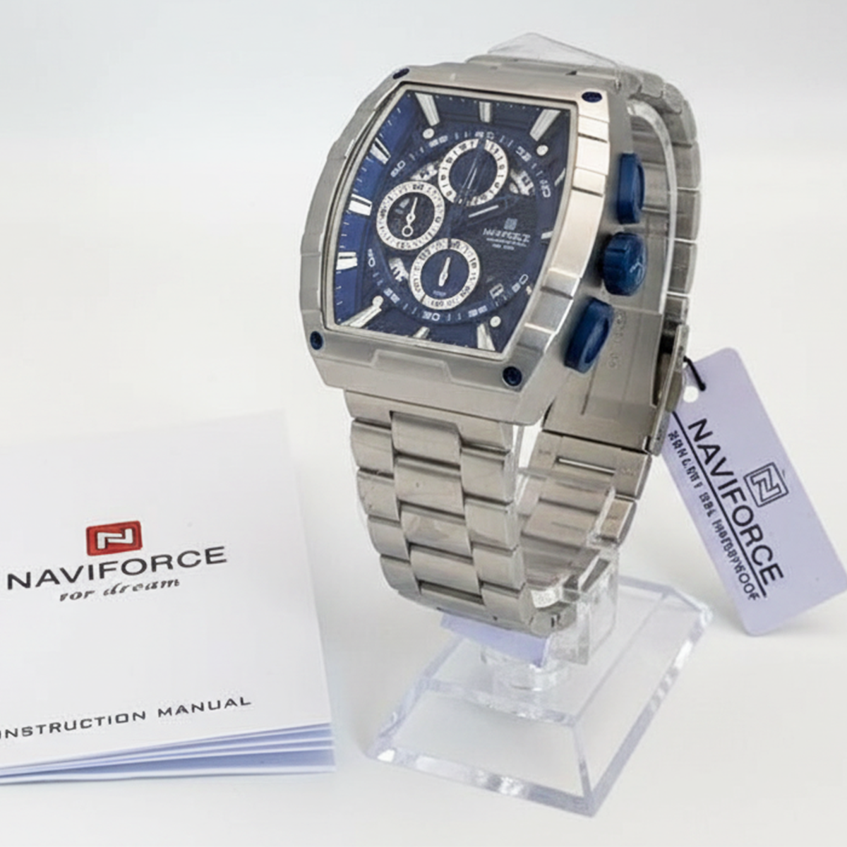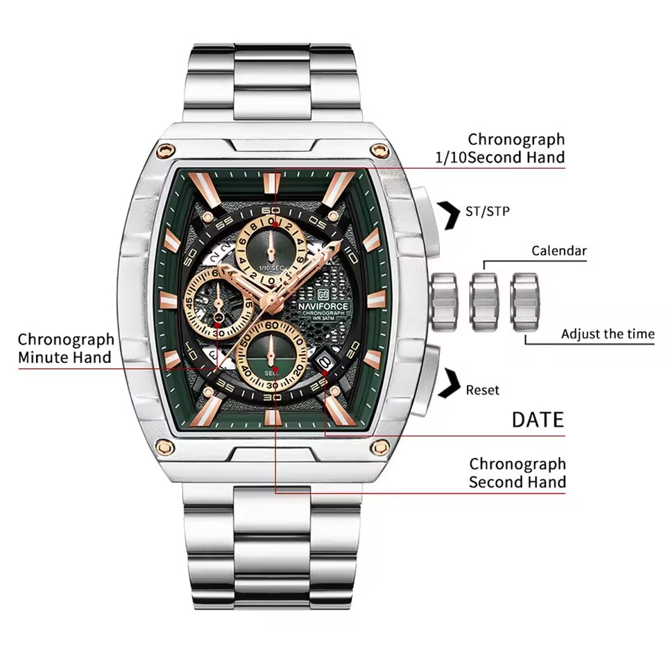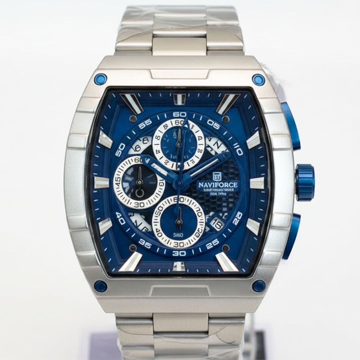 Montre homme NAVIFORCE 8066, chronographe multifonction argenté et bleu, boîtier en acier inoxydable étanche, bracelet sport en quartz, bracelet sport.